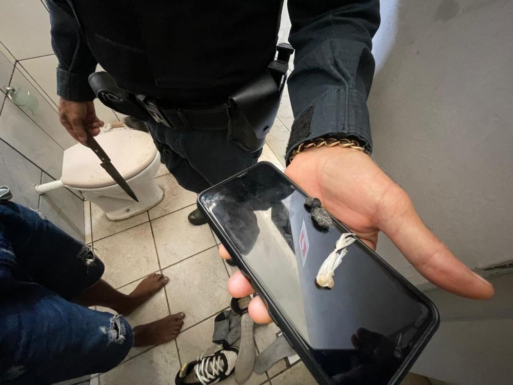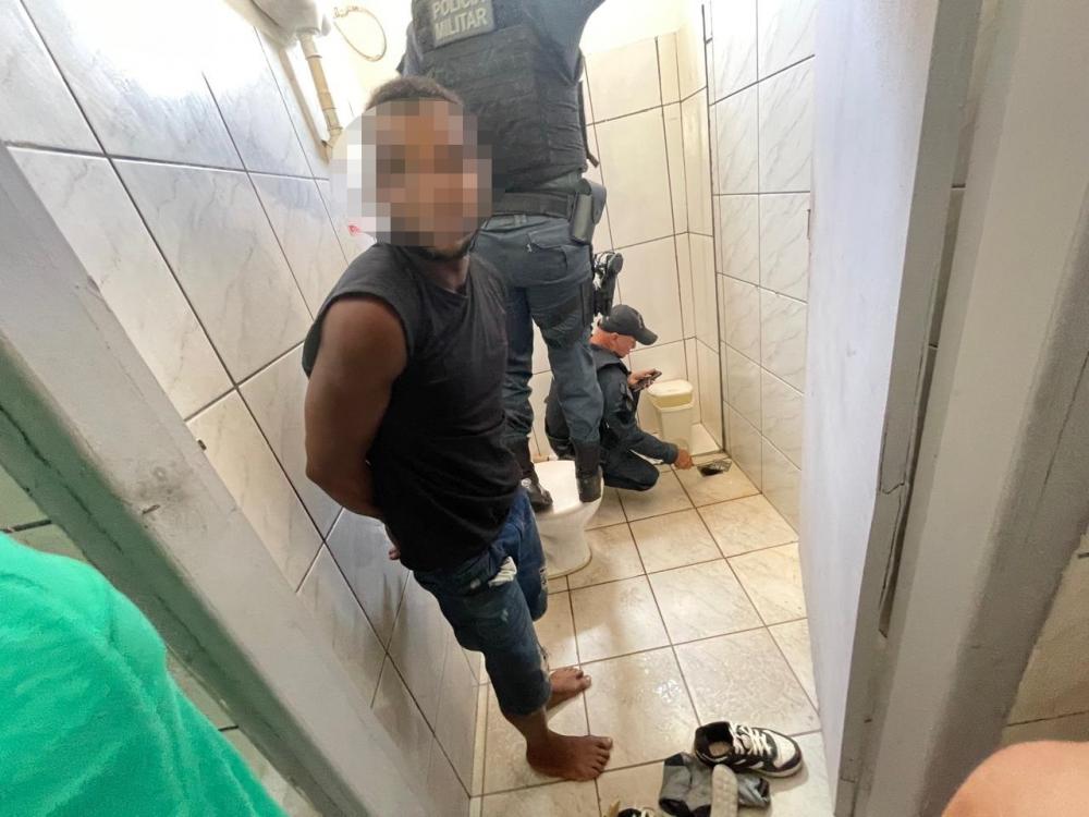 Ao se deslocarem até o local indicado, os policiais tentaram realizar a abordagem, momento em que o suspeito tentou fugir, correndo em direção ao banheiro do estabelecimento, mas foi alcançado e detido.
