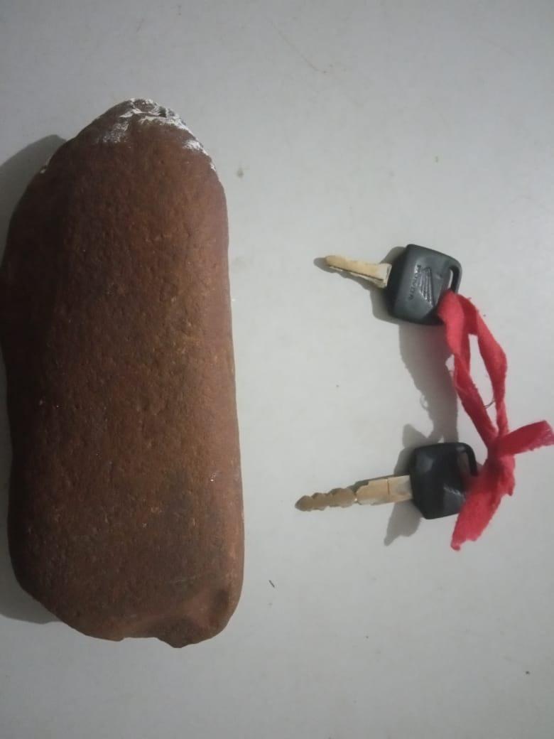 Com um dos responsáveis, foram encontradas duas chaves Micha (comumente utilizadas em furtos de motocicleta) e em busca pessoal, na blusa do adolescente havia estilhaços de vidro temperado.