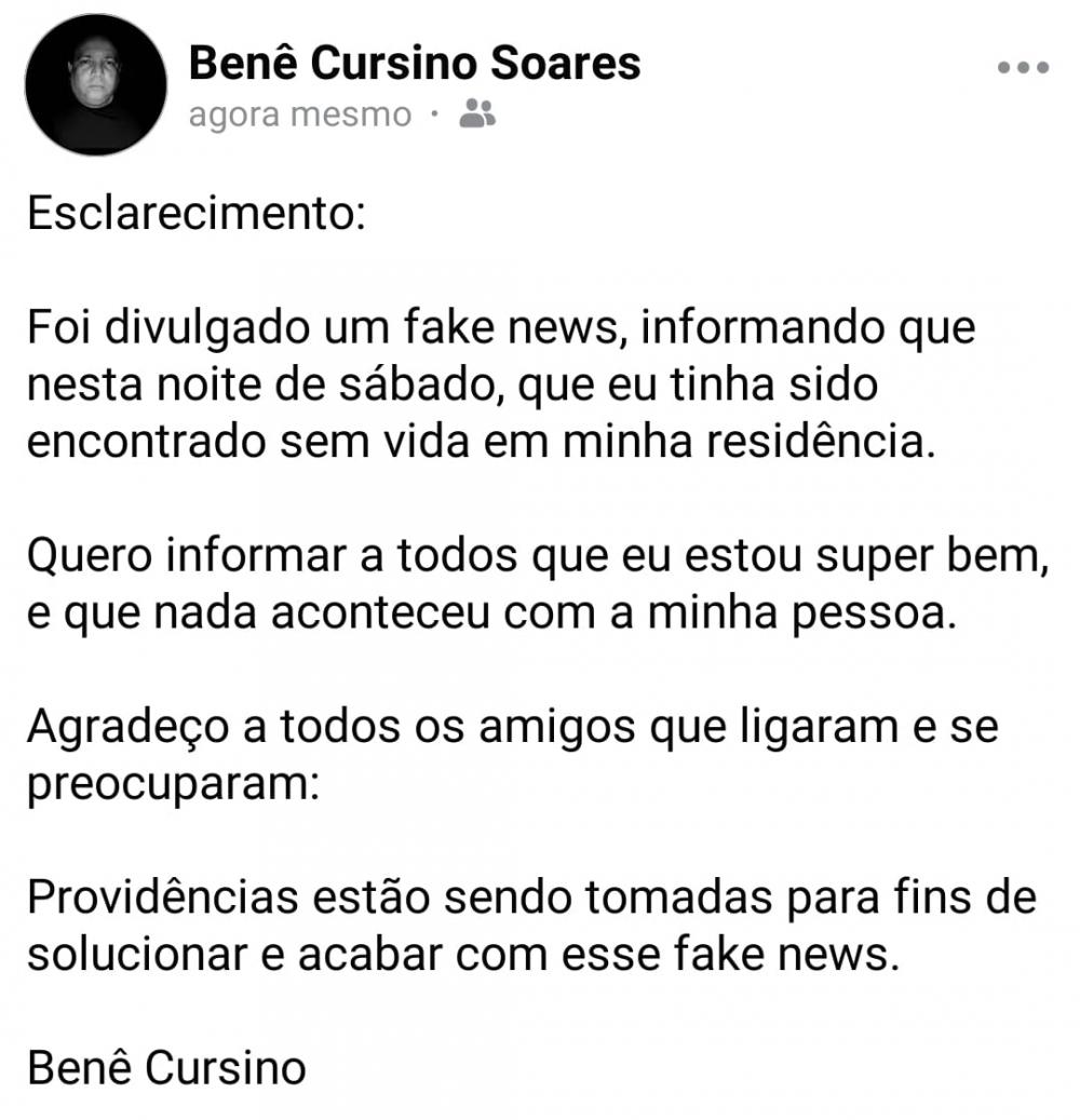 Benê atualmente trabalha na emissora Rádio Caçula como redator e repórter policial e disse à reportagem que ficou surpreso com a notícia divulgada por “Fake News”.