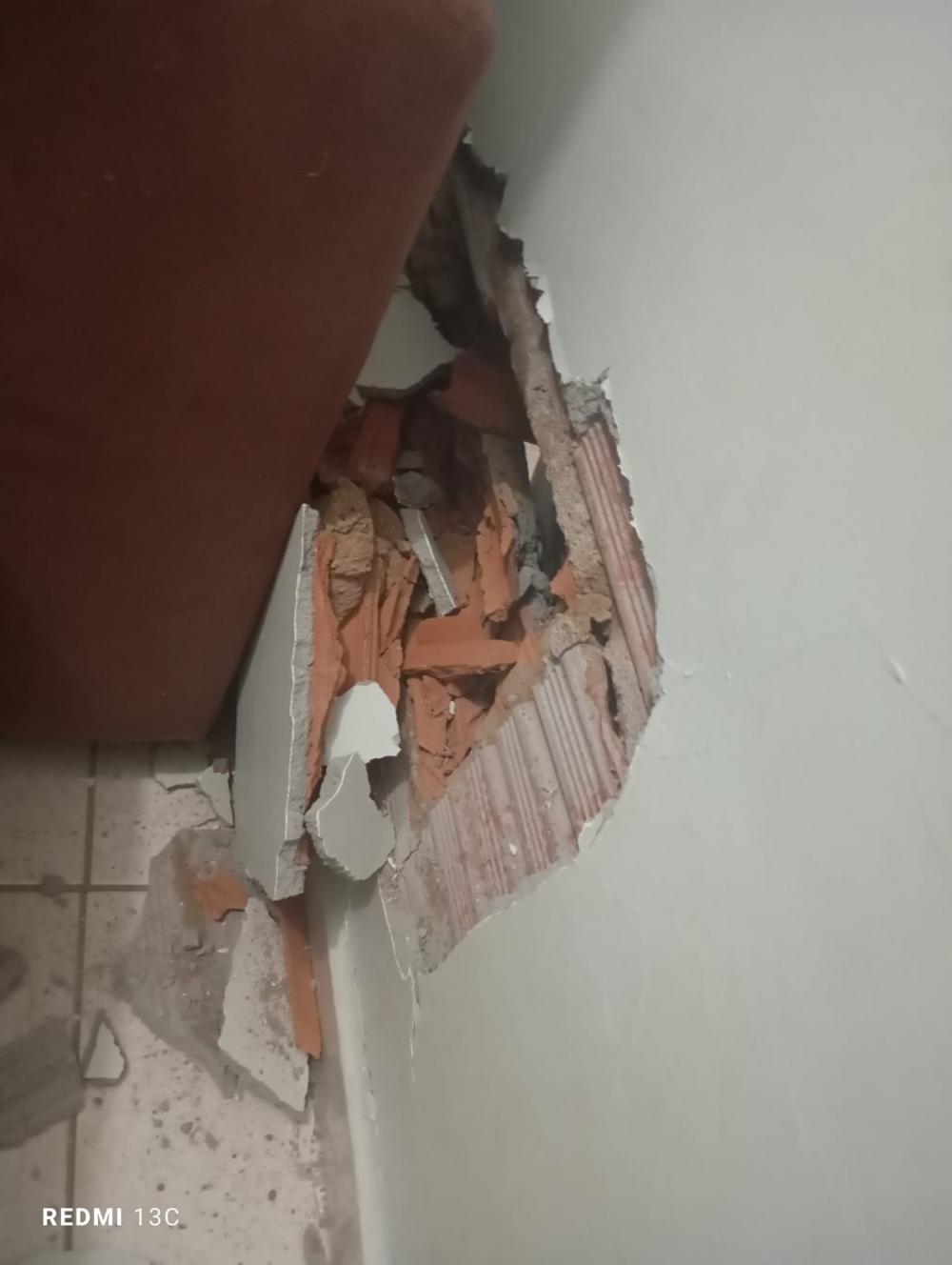 Com o impacto, o portão foi danificado e atingiu um carro da moradora que estava na garagem. A força da batida empurrou o veículo para frente, fazendo-o colidir contra a parede do imóvel, causando danos ao carro, na parede e ao portão.