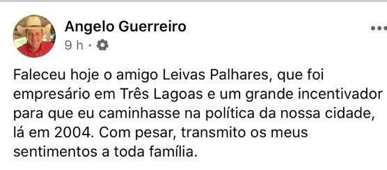 O prefeito de Três Lagoas, Angelo Chaves Guerreiro lamentou em sua página pessoal no facebook a morte de Leivas Hamilton Nery Palhares, que faleceu na manhã desta quarta-feira (01) na cidade de Aquidauana-MS após sofrer um infarto. Ele estava internado há mais de 30 dias devido alguns problemas de saúde.