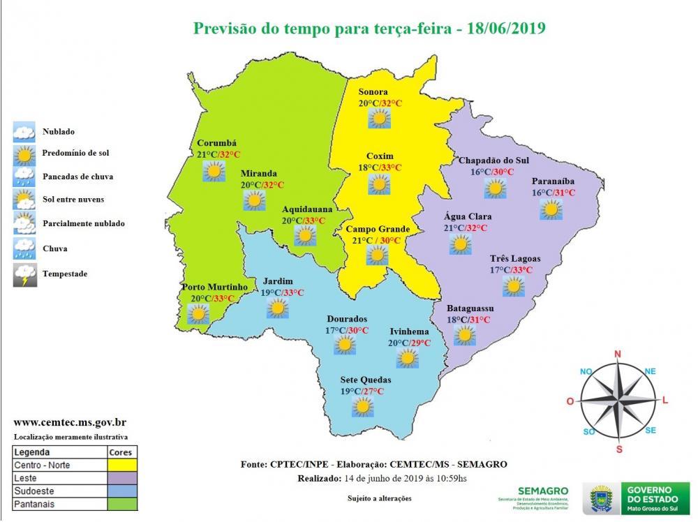 BATAGUASSU (MS) – Na cidade faz 17ºC nesta manhã e o dia deve ser de sol com algumas nuvens. Durante a tarde a temperatura na cidade chega à máxima de 31ºC. No período noturno a temperatura cai para 23ºC.